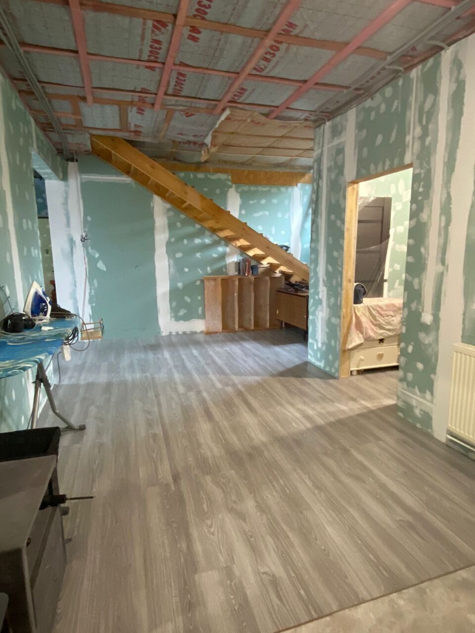 1-й этаж - большой зал совмещенный с кухней, так же имеется отдельная застекленная дверь с выходом на террасу через зал, большой коридор, отдельная гардеробная, котельная, огромный санузел, гостевая комната (спальня). На первом этаже постелен ламинат, стены обшиты гипсокартоном. Проведено электричество, канализация, отопление.