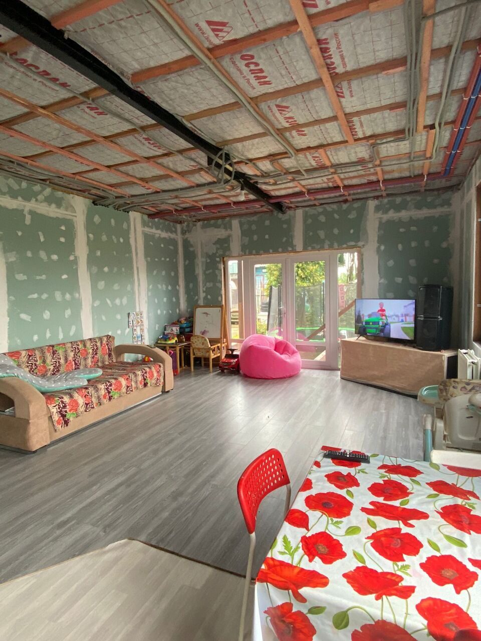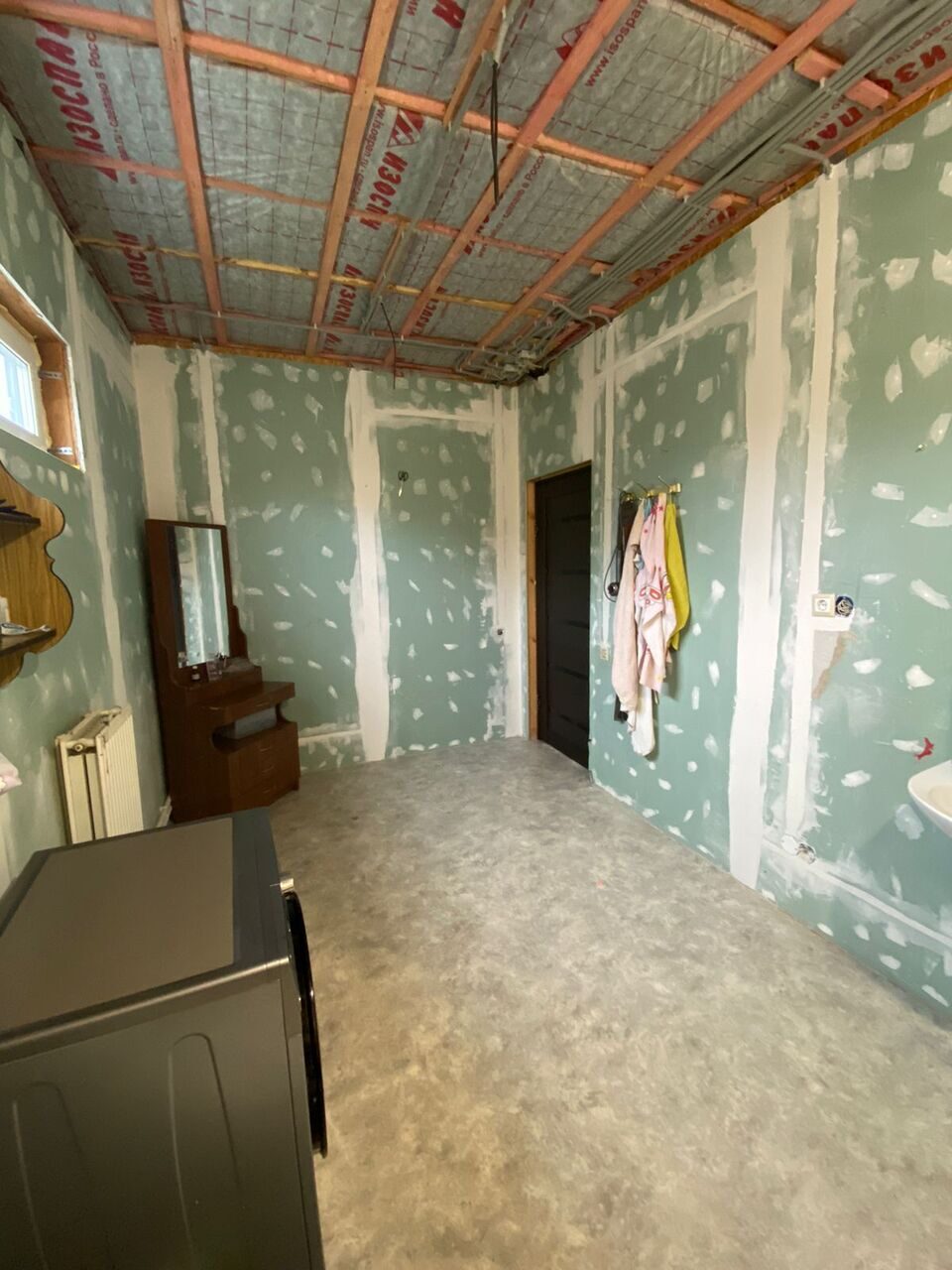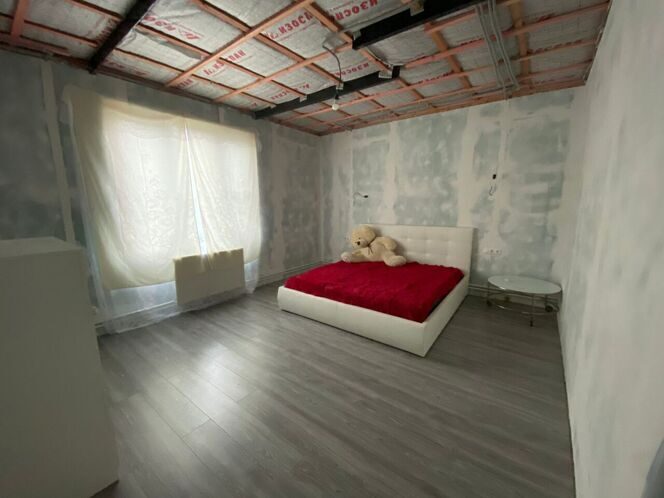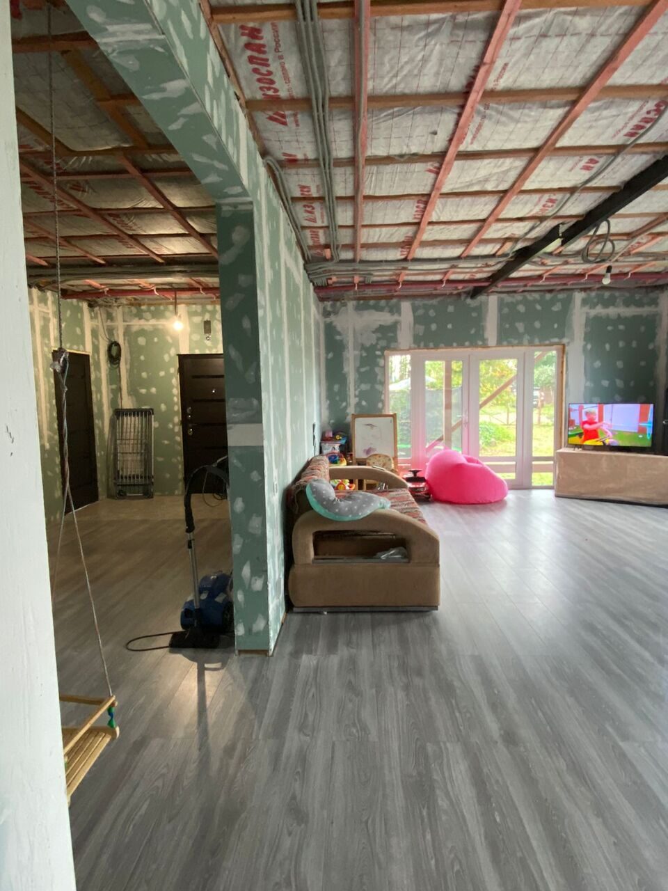 1-й этаж - большой зал совмещенный с кухней, так же имеется отдельная застекленная дверь с выходом на террасу через зал, большой коридор, отдельная гардеробная, котельная, огромный санузел, гостевая комната (спальня). На первом этаже постелен ламинат, стены обшиты гипсокартоном. Проведено электричество, канализация, отопление.