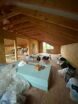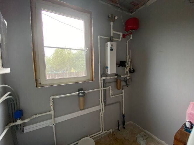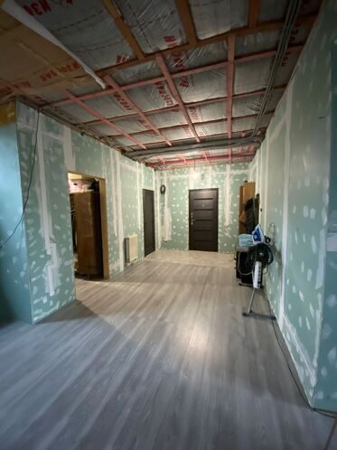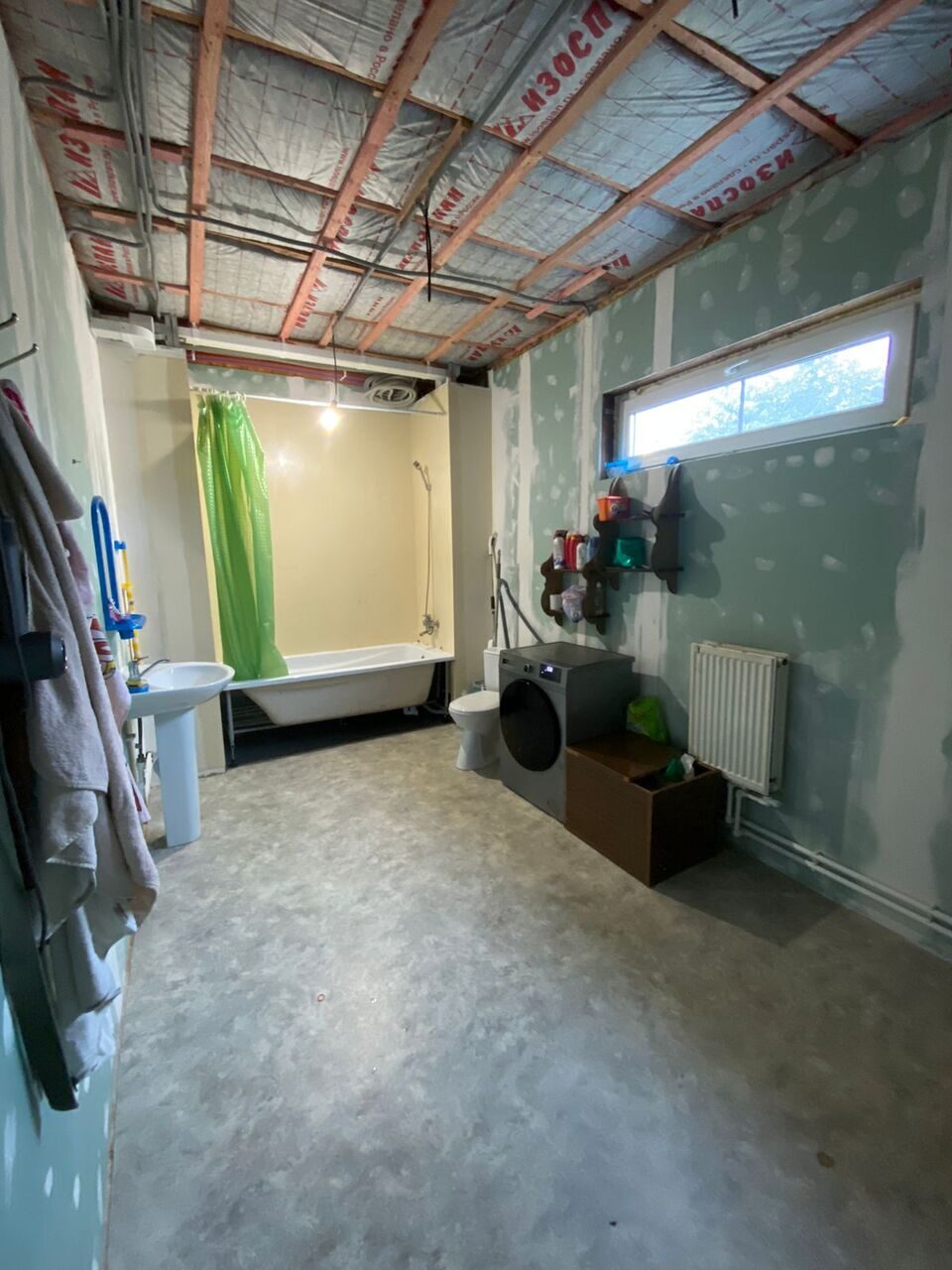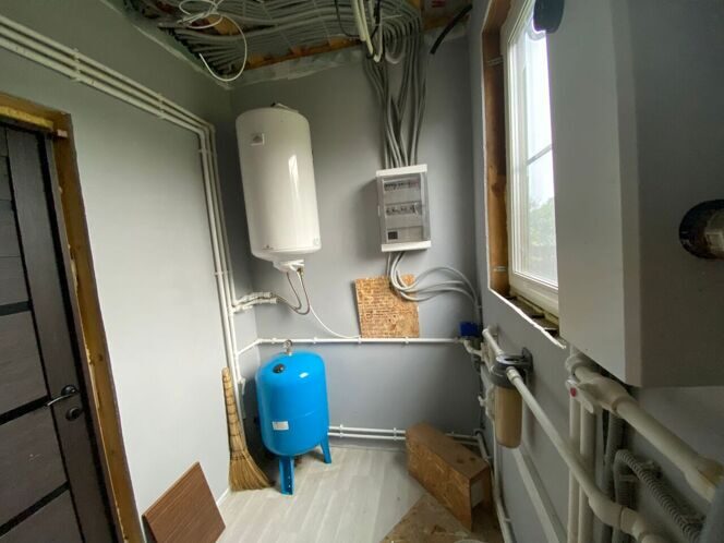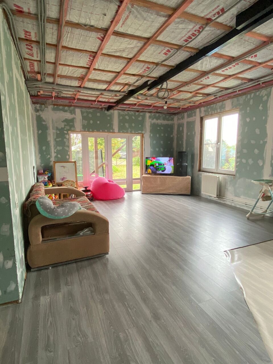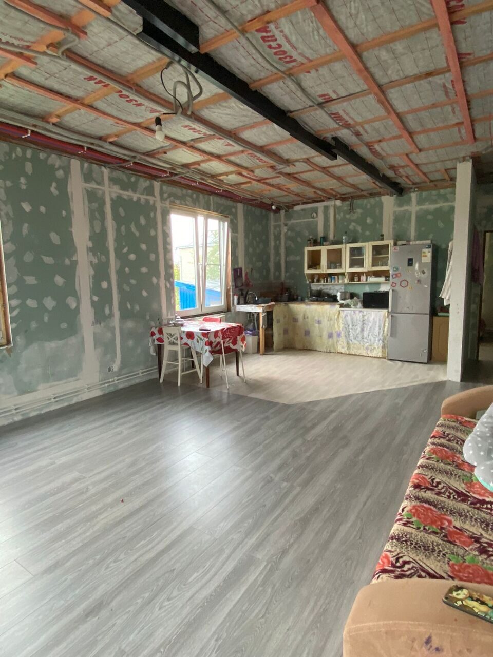 1-й этаж - большой зал совмещенный с кухней, так же имеется отдельная застекленная дверь с выходом на террасу через зал, большой коридор, отдельная гардеробная, котельная, огромный санузел, гостевая комната (спальня). На первом этаже постелен ламинат, стены обшиты гипсокартоном. Проведено электричество, канализация, отопление.